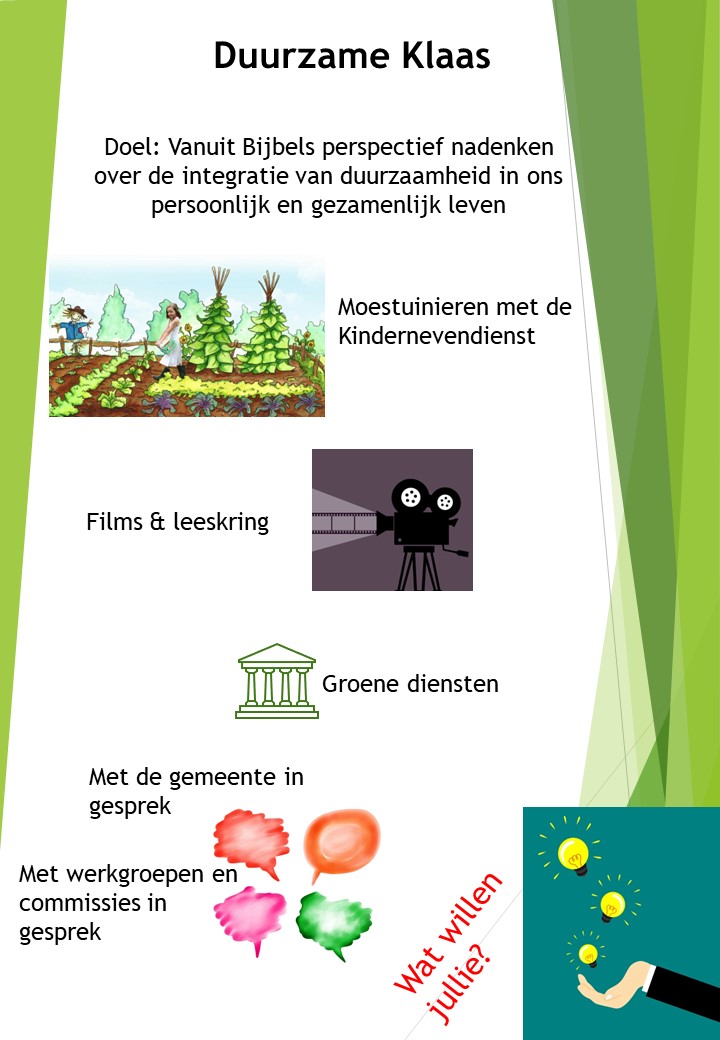 De werkgroep Duurzame Klaas is in 2023 gestart. De werkgroep sluit aan bij meerdere doelstellingen uit het beleidsplan van de gemeente. In het kort zijn dat: 1. Missie en visie: Zorg voor elkaar en de wereld krijgt alle aandacht. We laten ons inspireren en leiden door verhalen uit de Bijbel, die levend zijn door de verbinding met het hier en nu. 2. Het levende woord van God als basis: Het geloof vormt het uitgangspunt. Duurzaam leven is een christelijke opdracht. 3. Samen gemeente zijn: We organiseren verschillende activiteiten waarin gemeenteleden elkaar kunnen ontmoeten en met elkaar in gesprek kunnen gaan over duurzaamheid in relatie tot geloof. We hopen dat dit bijdraagt aan een inclusief en respectvol gesprek over de zorg voor de schepping. 4. Jong en oud betrekken: We richten onze activiteiten zowel op de jeugd, de tieners als de ouderen. 5. Kerk zijn in de wereld om ons heen: We zijn gericht op onze rol als gemeente in het zorgen voor de schepping. Dat betekent bijdragen aan een leefbare wereld, zorgen voor toekomstige generaties en alle anderen die nu al de gevolgen van de ecologische crisis voelen bijv. door extremer weer of de energierekening. |