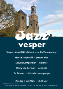 ![]() Muzikaal wordt de Vespercantorij Nicolaïkerk o.l.v. Ko Zwanenburg bijgestaan door Henk Kraaijeveld, jazzvocalist, Steven Kamperman, klarinet en Berry van Berkum, orgel. Voorganger is ds Bernard Luttikhuis. 🎶 Down by the Riverside – een bekend Afro-Amerikaans spiritual, in een sfeervol arrangement van David Greenwood. Een oproep tot vrede: “Ain’t gonna study war no more.” 🎶 When Israel Was in Egypt’s Land (Let My People Go) – een krachtige spiritual die het verlangen naar bevrijding vertolkt. Deze klassieker krijgt in de vesper een plek als stem van hoop en doorzettingskracht. 🎶 Psalm 136 – een chant van Ko Zwanenburg, waarin de steeds herhaalde regel “Want voor eeuwig is zijn vriendschap” op swingende wijze tot leven komt. Een psalm vol dankbaarheid in een verrassende muzikale jas. Welkom om stil te staan, mee te zingen, te luisteren en je te laten raken door jazz en bezinning. De dienst kunt u meevieren via kerkomroep | ||